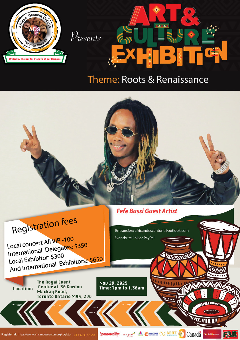 - 3rd International Art & Culture Exhibition- Theme: Roots & Renaissance is more than just an exhibitionit’s a dynamic celebration of African legacy, the ongoing evolution of African art, and the profound cultural influence of the African diaspora across the globe. Set against the backdrop of Toronto’s diverse cultural fabric, this event serves as a bridge between continents, generations, and artistic forms.Key Themes: